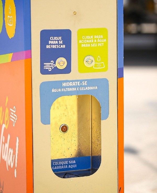 Além de aliviar o calor, o refrescador também permite que os usuários ofereçam água para animais, reforçando o cuidado com todos que circulam pelas ruas da cidade neste período de grande fluxo.