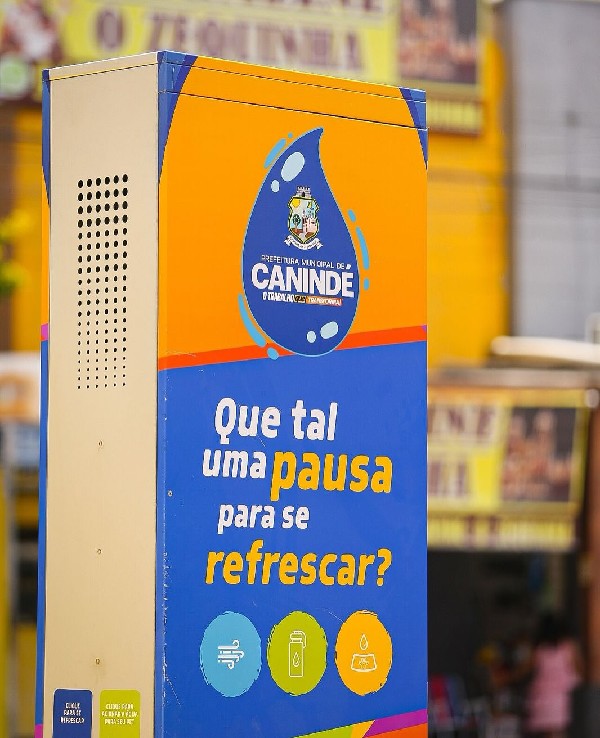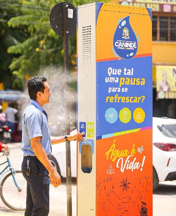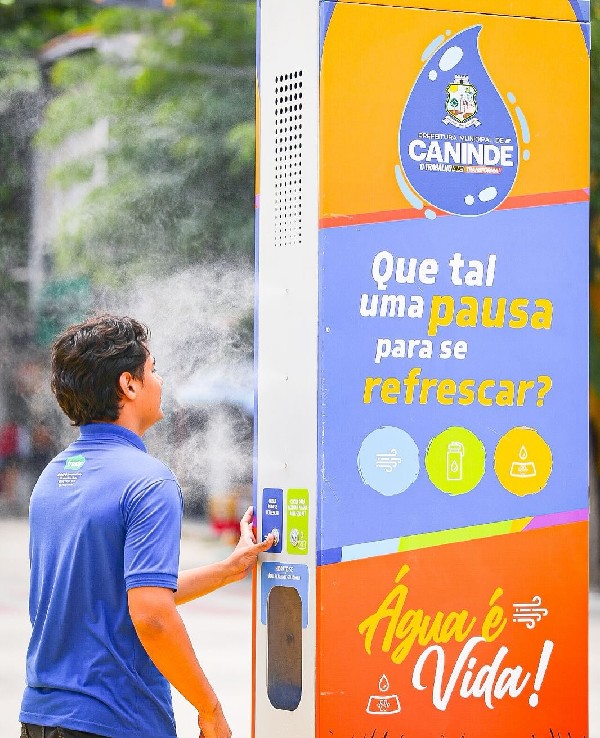 Uma iniciativa simples, mas de grande impacto, está fazendo sucesso entre quem vive e visita Canindé: o refrescador instalado pela Prefeitura já se tornou um ponto de acolhimento nos dias mais quentes da cidade. O equipamento oferece água potável para hidratação e ainda proporciona um jato suave de água no rosto, ajudando a amenizar o calor, especialmente durante as longas caminhadas da Festa de São Francisco.